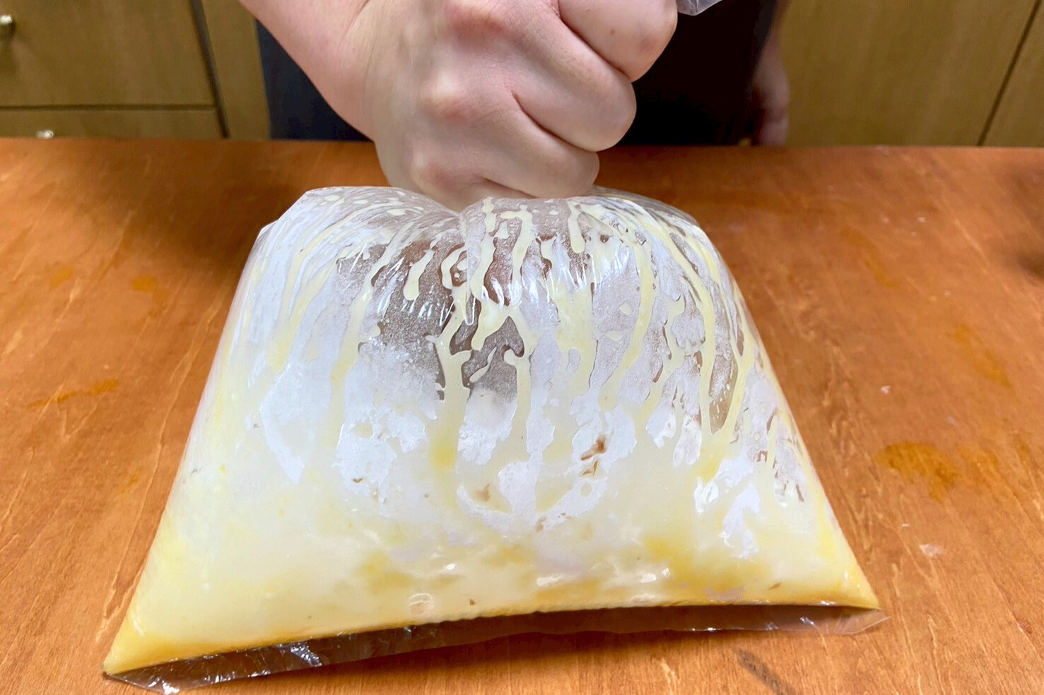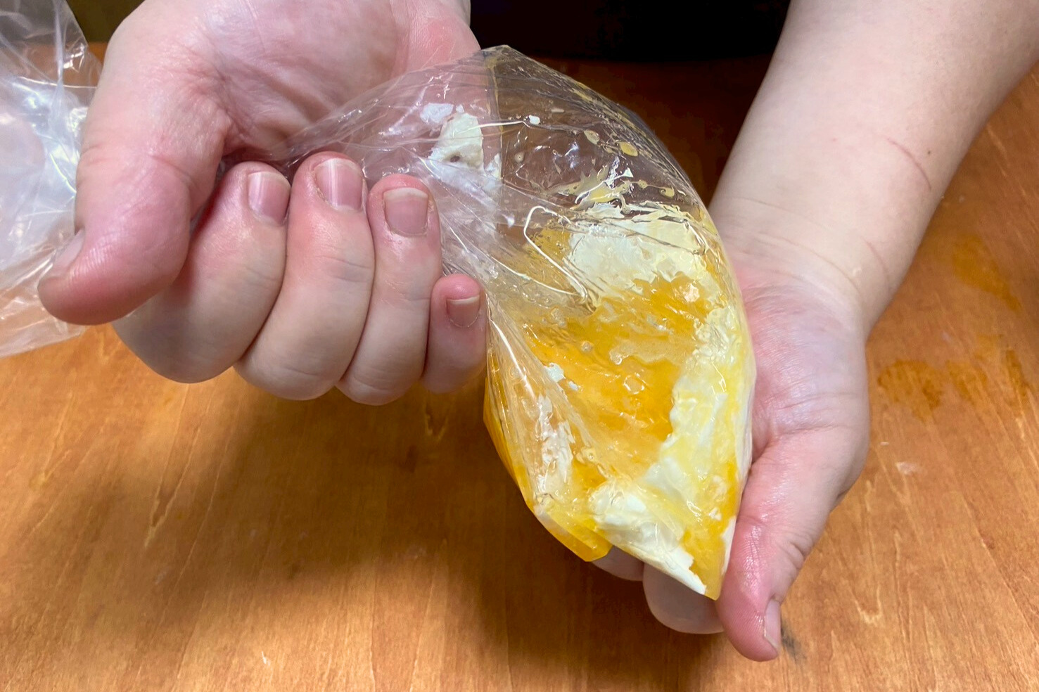 2.ポリ袋に、たまごをいれ、もみほぐす。さとう、油、